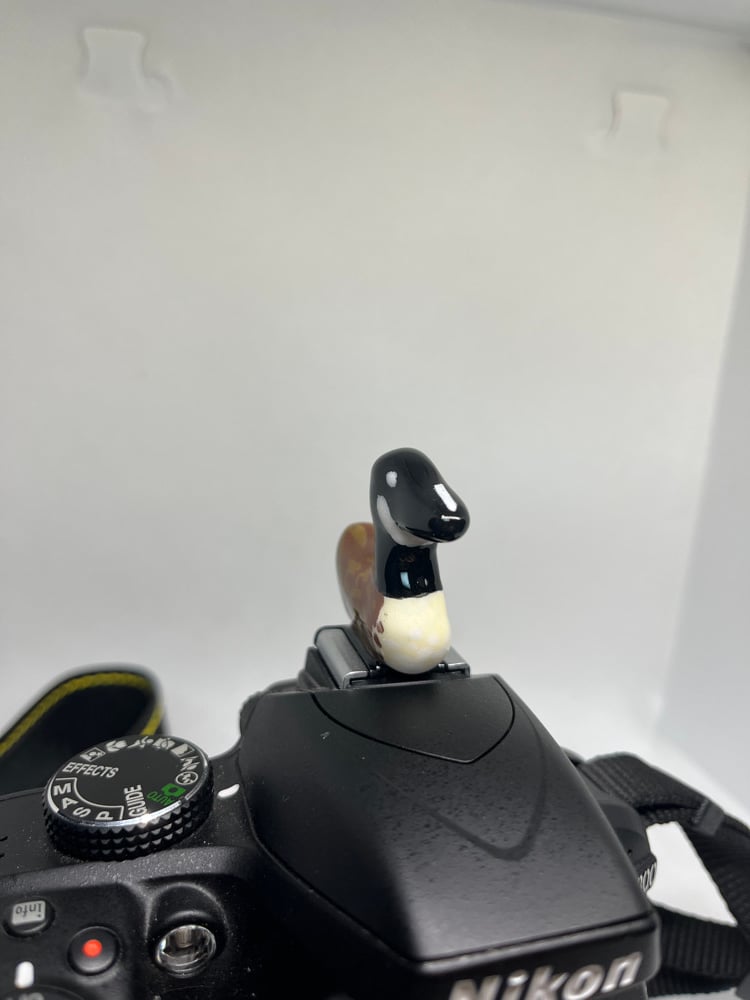 Handmade Canada Goose (Branta canadensis) hotshoe cover. The cover can protect the sensitive hot shoe from dust, moisture, and scratches. Most importantly, it lets you have a little bird friend help you take your photos!