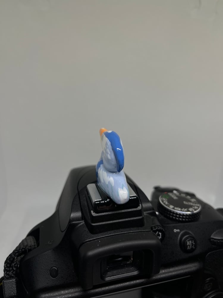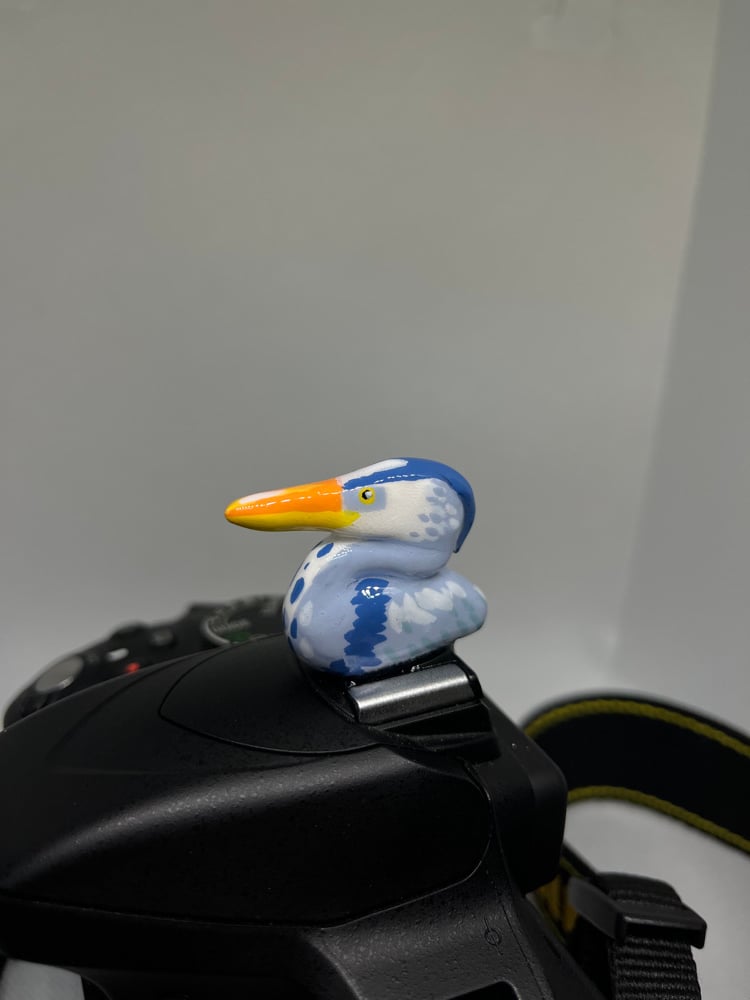 Handmade Great Blue Heron hotshoe cover. The cover can protect the sensitive hot shoe from dust, moisture, and scratches. Most importantly, it lets you have a little bird friend help you take your photos!