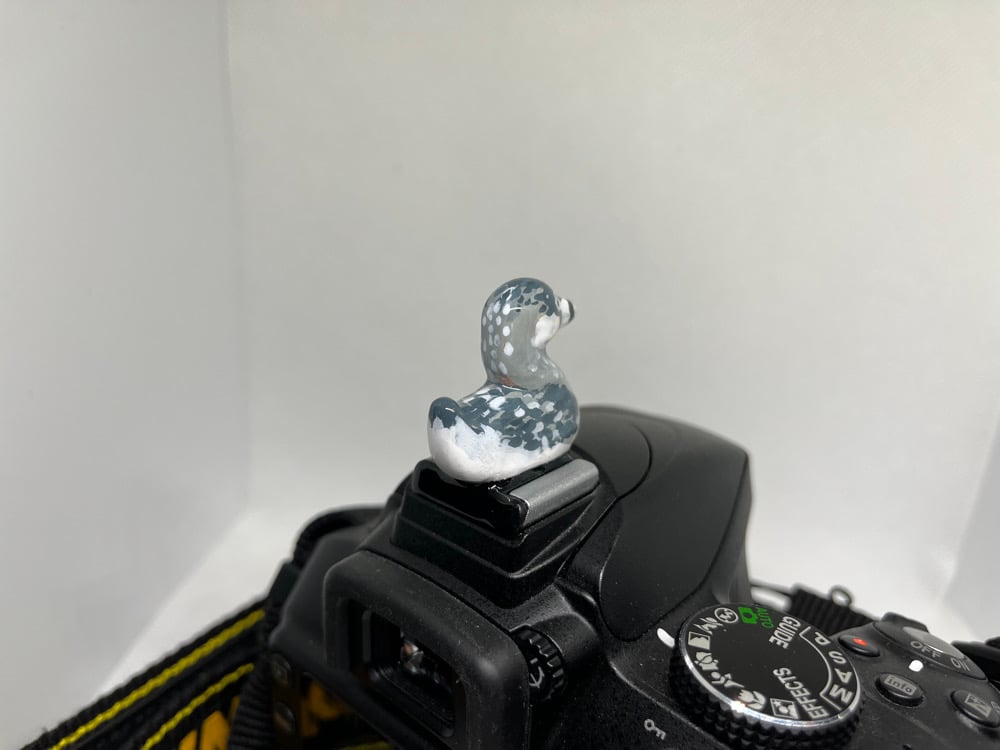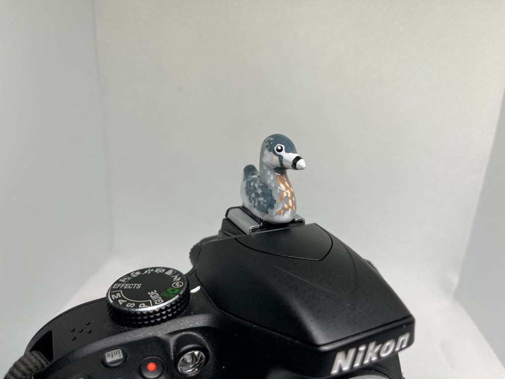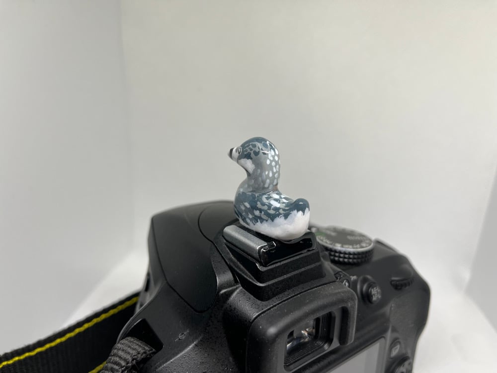 Handmade Pied-billed Grebe hotshoe cover. The cover can protect the sensitive hot shoe from dust, moisture, and scratches. Most importantly, it lets you have a little bird friend help you take your photos!