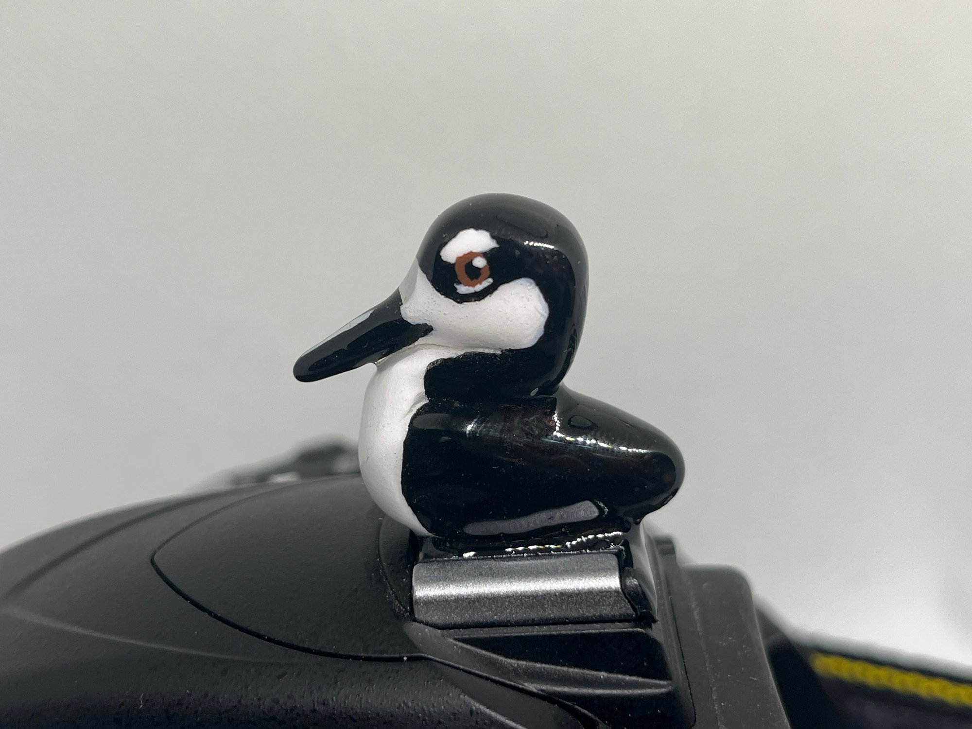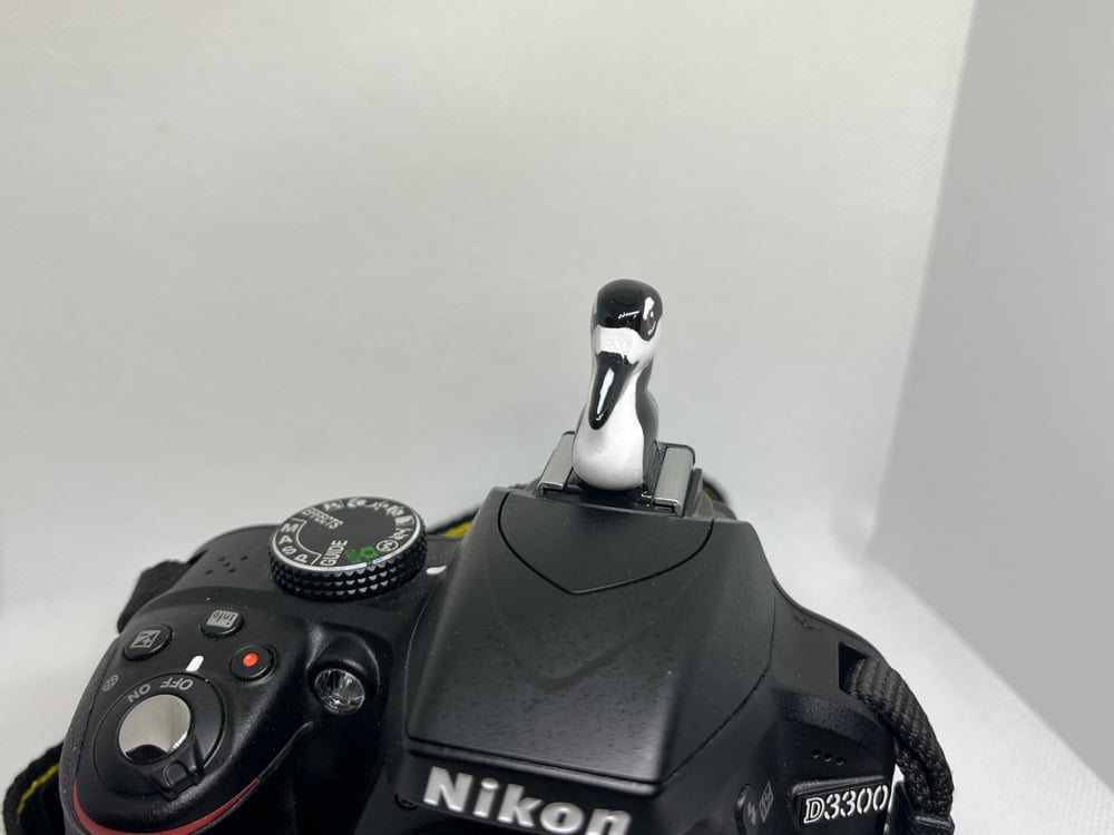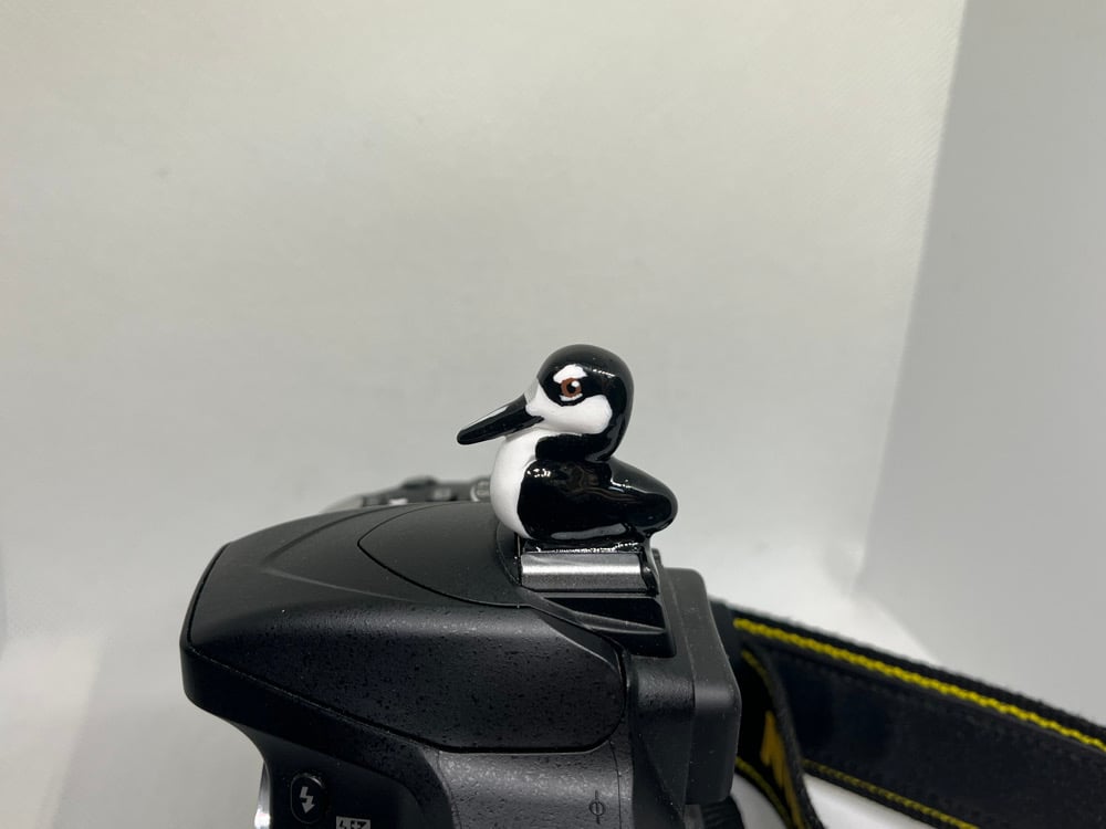 Handmade Black-necked Stilt hotshoe cover. The cover can protect the sensitive hot shoe from dust, moisture, and scratches. Most importantly, it lets you have a little bird friend help you take your photos!